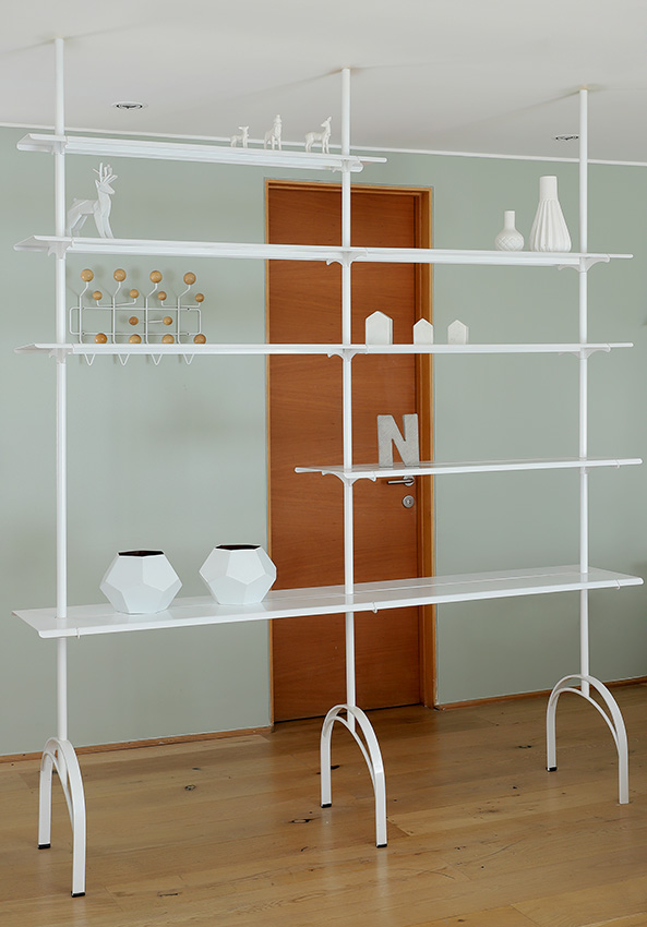 Fabricada en tubos y planchas metálicas con corte láser y pintura al horno. Es un mueble visualmente liviano, se puede desarmar, trasladar y regular la altura de los estantes.